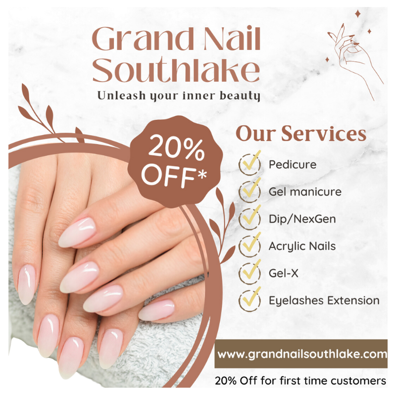Welcome to Grand Nail Spa,a premier nail salon located in heart of Southlake! We pride ourselves on offering a relaxing and luxurious environment where you can unwind and indulge in top-quality nail care.As a veteran-owned establishment,we bring a commitment to excellence,precision, and outstanding service to everything we do.Whether you're looking for a fresh manicure,a creative nail design,or a complete spa experience,our skilled teamis here to make sure you leave feeling pampered and satisfied.We invite you to visit and experience the best nail care at Grand Nail Spa-where your comfort and satisfaction are our top priorities !